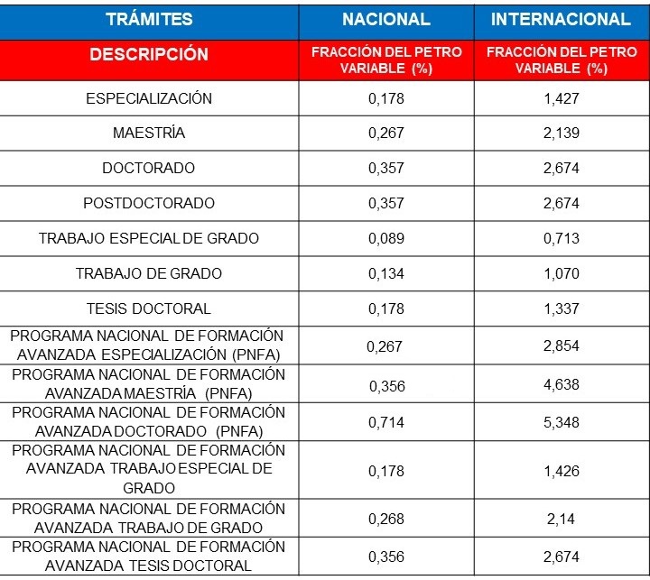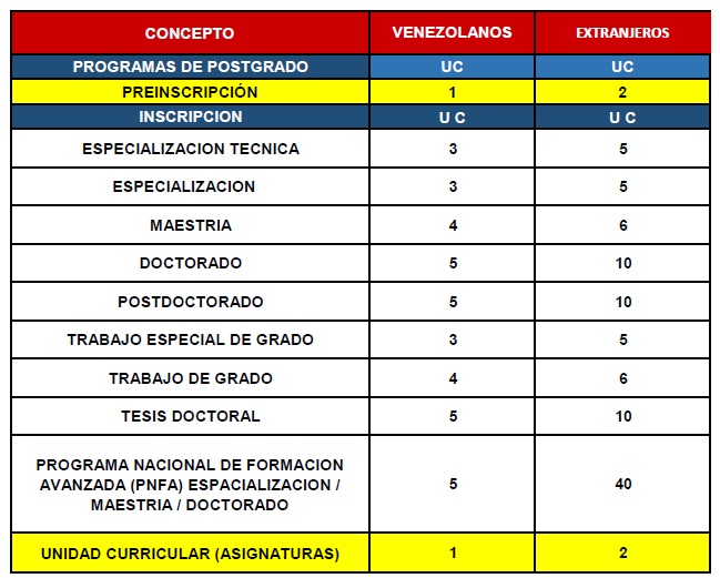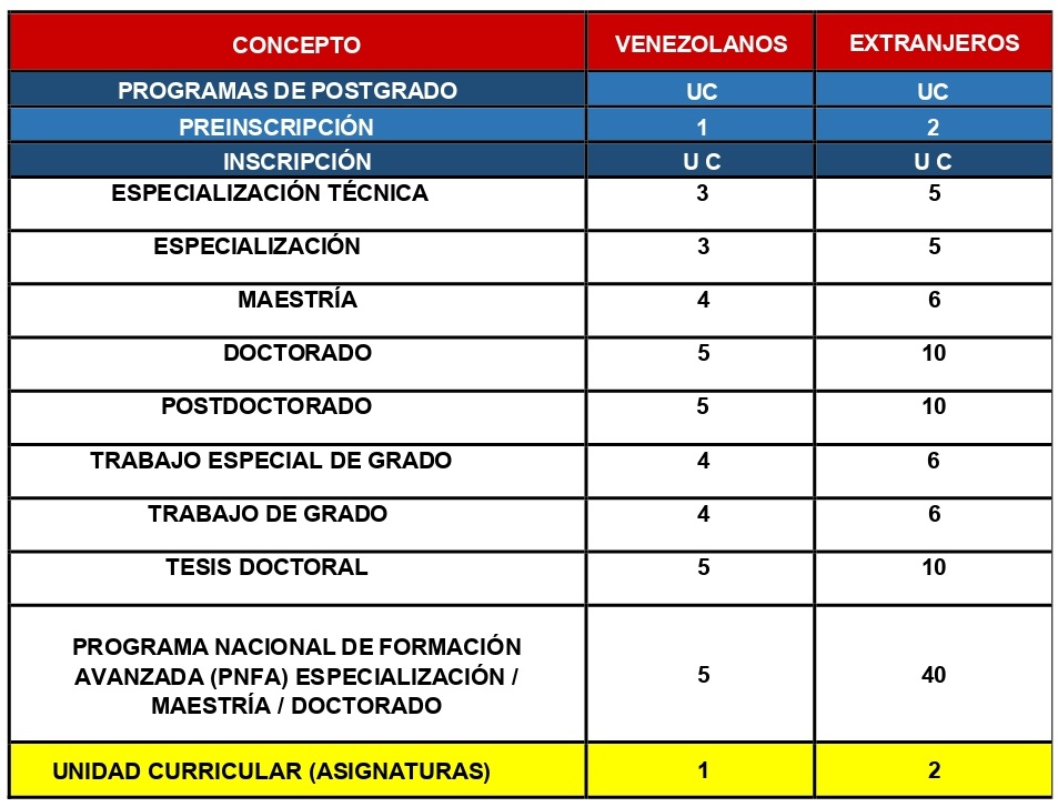 *EL VALOR DE LA UNIDAD CREDITO (UC) SERA EQUIVALENTE A OCHO (8$) TOMANDO COMO REFERENCIA LA COTIZACION OFICIAL DEL DIA SEGÚN LA TASA DEL DÓLAR EN EL BANCO CENTRAL DE VENEZUELA.ARANCEL DE GRADO